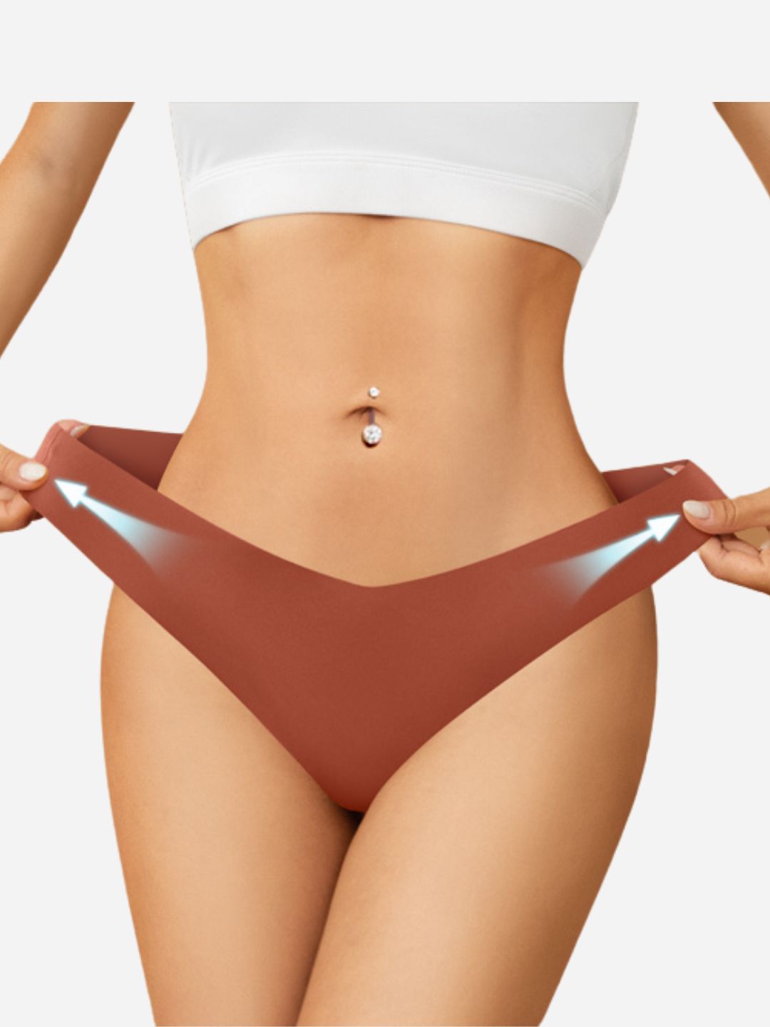 - The back of the garment typically consists of a thin waistband and a thin strip of material, designed to be worn between the buttocks, that connects the middle of the waistband with the bottom front of the garment.